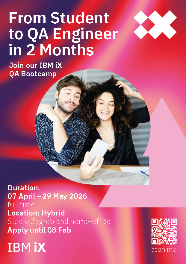 IBM iX pokreće intenzivni dvomjesečni QA Bootcamp, osmišljen kako bi educirao i pripremio novu generaciju mlađih QA inženjera za rad u području ručnog i automatiziranog testiranja software-a. Program je snažno usmjeren na praktično učenje kroz rad na projektima, uz mentorstvo iskusnih QA inženjera.